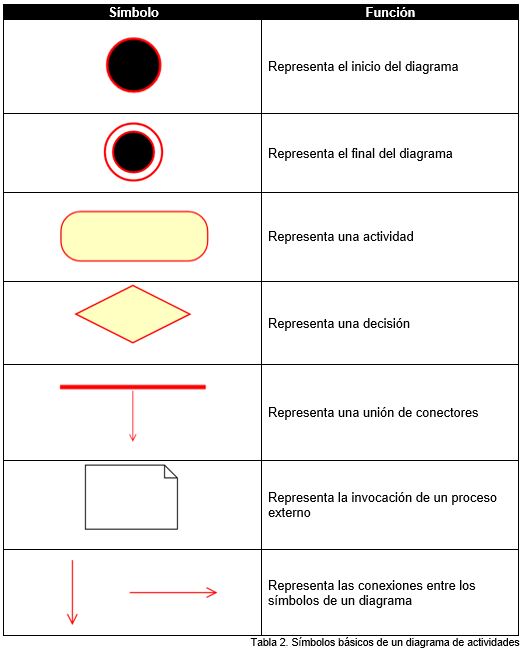 Los diagramas de actividades permiten diseñar algoritmos de forma similar a como se hace en un diagrama de flujo, la única diferencia es que en este tipo de diagramas las entradas, los procesos y las salidas se consideran actividades y estas se representan con un único símbolo. Para construir un diagrama de actividades debes emplear los siguientes símbolos: