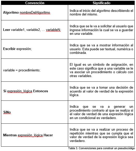 Para construir un pseudocódigo de cualquier algoritmo diseñado, debes tener en cuenta algunas convenciones: